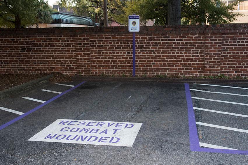 The university used purple paint and signage to designate a new ADA-compliant Purple Heart van parking lot near the World War Memorial building on Columbia’s campus. Photo Credit: University of South Carolina.